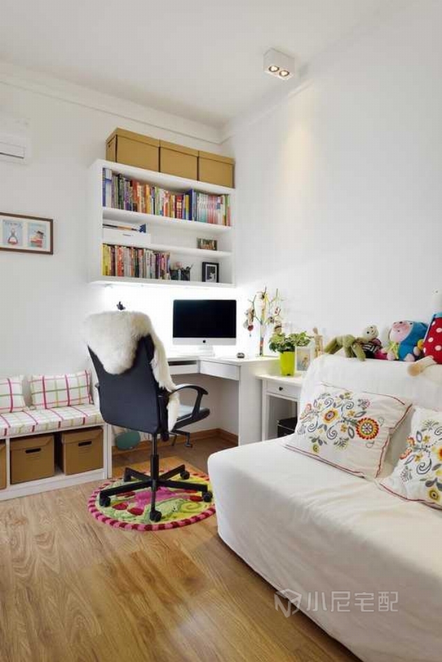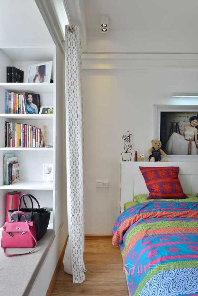 利用飄窗臺設置書柜,增加儲物的同時,也讓物品的收納更加集中美觀
