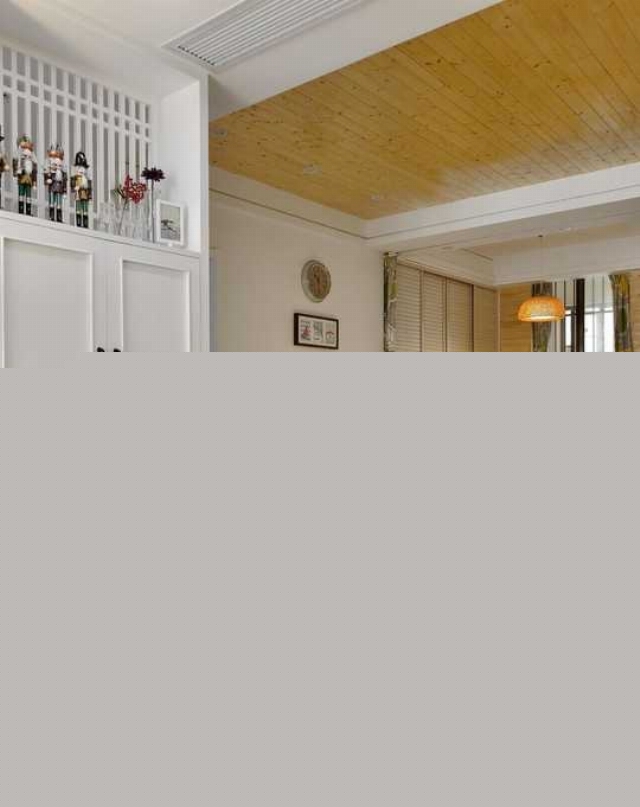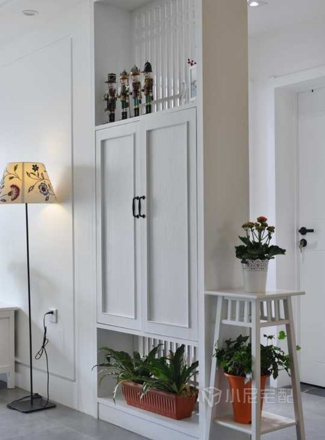 隔斷柜上下半通透處理,滿足過道的采光通風,中間帶柜門的部分滿足了客廳的儲物功能,同時合理的規(guī)避了衛(wèi)生間門對著客廳的尷尬。