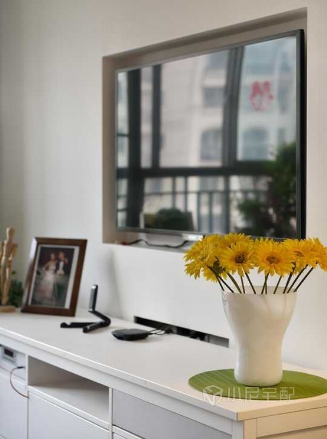 電視墻采用歐松板飾面,白色實色漆啞光,電視內嵌處理。與購置的宜家成品電視柜搭配完美。
