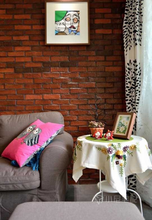 客廳墻面肌理采用低溫陶土磚,讓整體的格調和風格和諧統(tǒng)一。