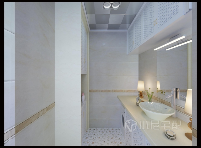 衛(wèi)生間采用兩色拼接鋁扣板設計,梳洗臺整體設計,連同洗衣機裝于臺下,使用空間大大提升