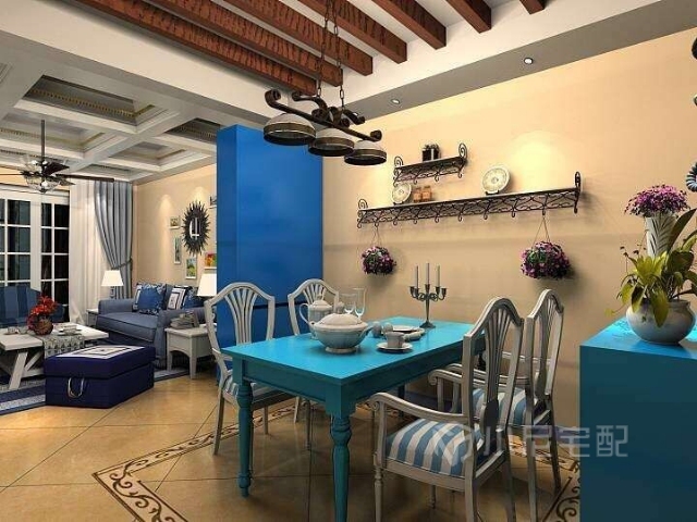 地中海風(fēng)格的靈魂就是“蔚藍(lán)色的浪漫情懷,海天一色、艷陽高照的純美自然”。設(shè)計中添加咖色以中和色調(diào),爛漫中不失沉穩(wěn)