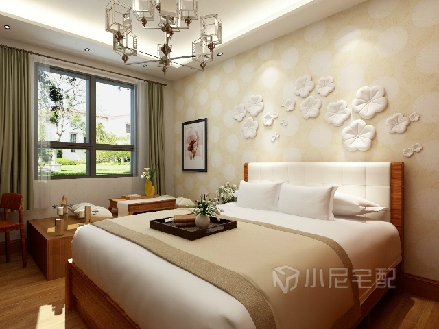 床頭暖黃色蒲公英的花紋的壁紙,白色五角梅的裝飾,使臥室盡顯優(yōu)雅唯美。