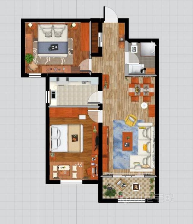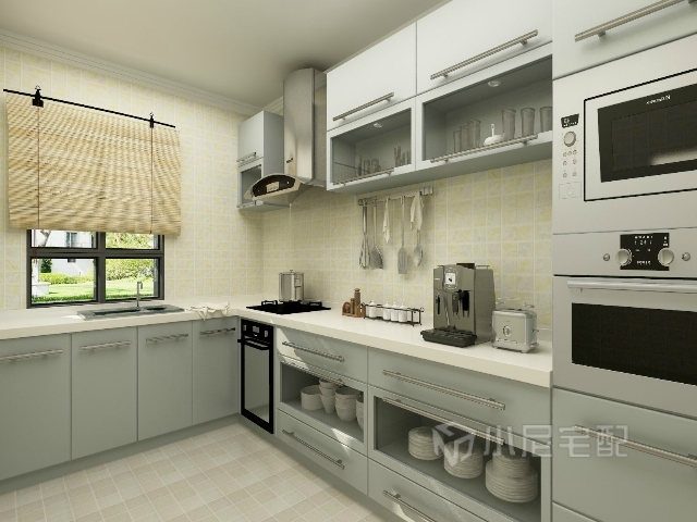 淡黃色墻磚,灰色方格地磚,竹卷簾,L型櫥柜,功能強(qiáng)大,簡單時尚。