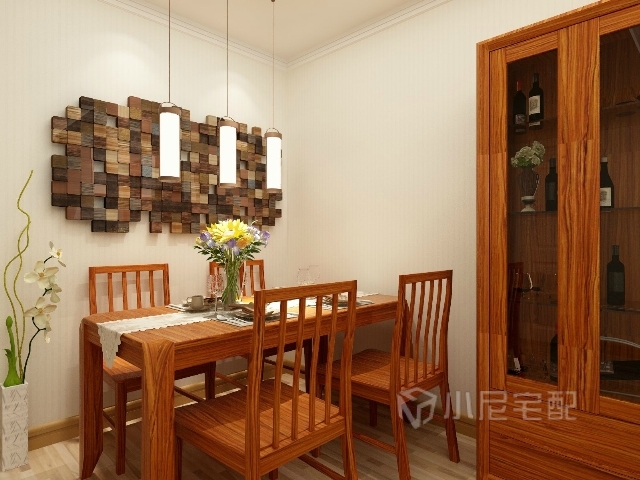 黃金柚木的餐桌椅,酒柜,造型簡約的長筒吊燈,木飾馬賽克的裝飾,華麗卻不顯得沉悶。