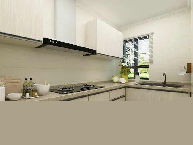 白橡實(shí)木櫥柜搭配石英石的臺(tái)面,造型簡(jiǎn)約,功能齊全。