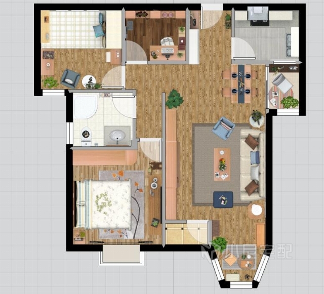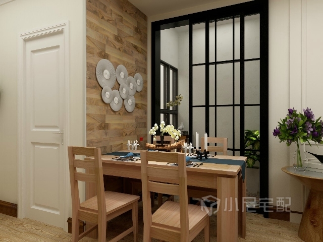 用木飾面裝飾了一整面墻,再搭配掛件,起到了柔和了整個(gè)空間的效果。