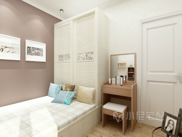 淡褐色的墻紙搭配現(xiàn)代裝飾畫,定制榻榻米加衣柜使整個(gè)房間一下就多出幾平米的利用空間。