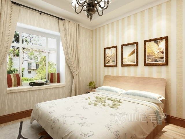 暖色的壁紙搭配棕色裝飾畫,一扇飄窗配上兩個(gè)抱枕,顯得悠閑舒適。