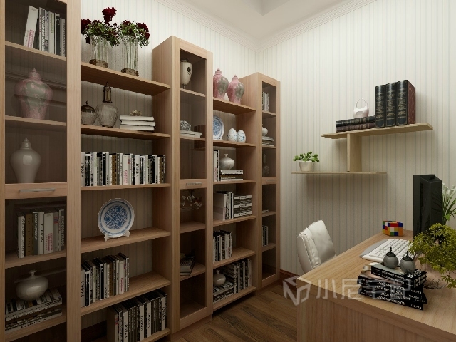 一整面的大書柜,淡色條紋壁紙,打造一個(gè)安靜的工作空間。