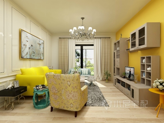 電視墻選用鮮艷的黃色,和沙發(fā)顏色相呼應(yīng),電視柜組合可以增加儲(chǔ)存功能,顯得空間干凈整潔。