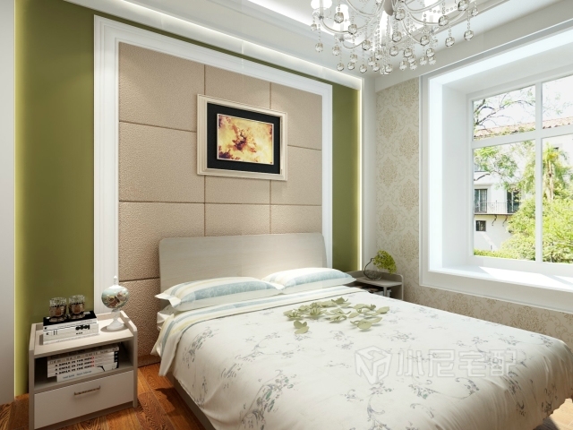 具有現(xiàn)代感的背景墻,草綠色的配色,讓空間顯得十分明亮開朗。