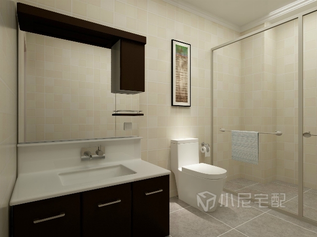 衛(wèi)生間最需要干凈衛(wèi)生,深色的浴室柜,淺色的墻磚地磚,隔開的淋浴房,干濕分離,易于清潔打理。