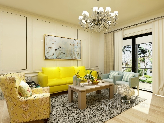 白色木飾面板,檸檬黃的布藝沙發(fā),灰色的地毯,開闊明亮的客廳,簡潔又舒適。