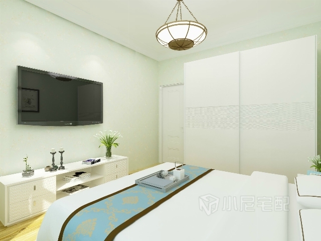 推拉門衣柜節(jié)約空間,配套的電視柜,可愛(ài)的鐵藝吊燈,整體協(xié)調(diào)溫馨。