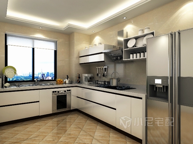 選用黑白簡約的櫥柜,黃色的地磚和墻磚,顯得十分溫馨。