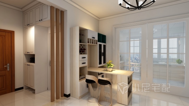 折疊餐桌使酒柜和餐桌有機(jī)的結(jié)合,起到了節(jié)省空間的作用。木色的材質(zhì),更突出了溫馨自然的風(fēng)格。