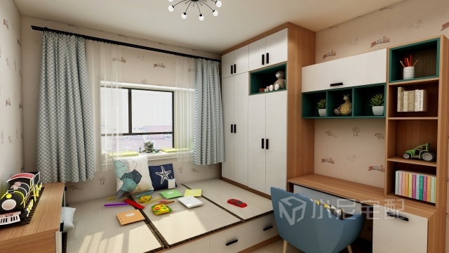 兒童房采用小尼宅配定制榻榻米方案,舒適的原木色柜體配上純白烤漆門板,加以藍(lán)綠色點(diǎn)綴,讓整個(gè)房間有了童趣感,配上簡(jiǎn)單的書桌,滿足了小主人的所有需求。