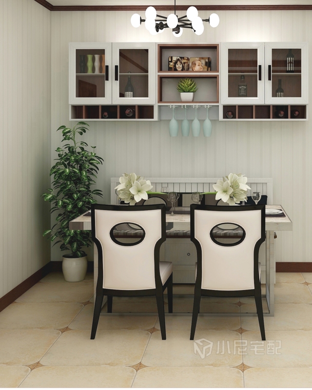 餐廳用小尼宅配定制一組掛墻式酒架,精巧實(shí)用,顏色和餐椅很搭,都用的深淺撞色。
