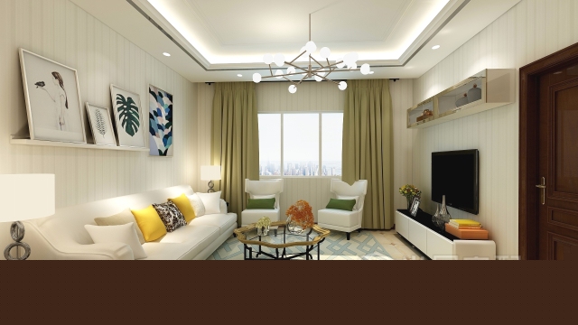 客廳用黃綠色搭配整個(gè)淺色空間既舒適又活潑,電視墻尺寸較小,用簡(jiǎn)潔的電視柜和掛墻吊柜就有了造型感。