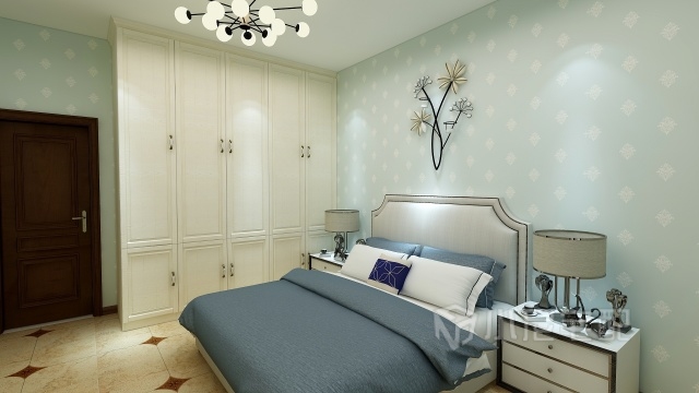 主臥室小尼宅配定制的衣柜給了主人很大的儲(chǔ)物空間,淡淡的藍(lán)色墻紙顯得整個(gè)房間舒適而透亮。