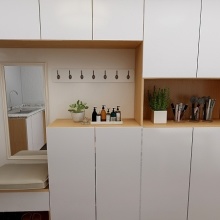 本方案客戶家實際戶型狹長,且還要滿足90后新婚夫妻倆的基本生活需求,所以整體風格偏簡約,而且每一處空間都不允許浪費,故此,整體的設(shè)計更多的考慮到多功能性,達到客戶理想中的溫馨小窩。