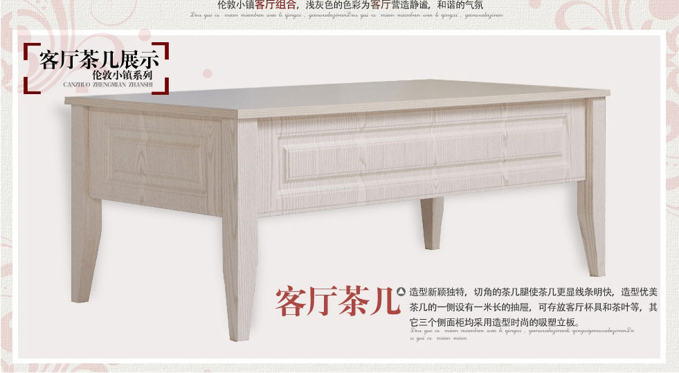 | 細(xì)節(jié)描述 | 客廳柜干凈利落的線型,古典的紋理將英倫色彩完美演繹加上通透的玻璃門,勾勒出家具的風(fēng)韻與格調(diào);茶幾造型新穎獨(dú)特,切角的茶幾腿使茶幾更顯線條明塊,造型優(yōu)美;間廳柜在起到分割的作用的同時(shí),其文雅的線條和時(shí)尚的造型也起到了裝飾作用;沙發(fā)是根據(jù)人體學(xué)設(shè)計(jì),扶手端正,坐感舒適,不易疲乏,支腳采用優(yōu)質(zhì)五金,配膠墊,防劃傷地板。 |