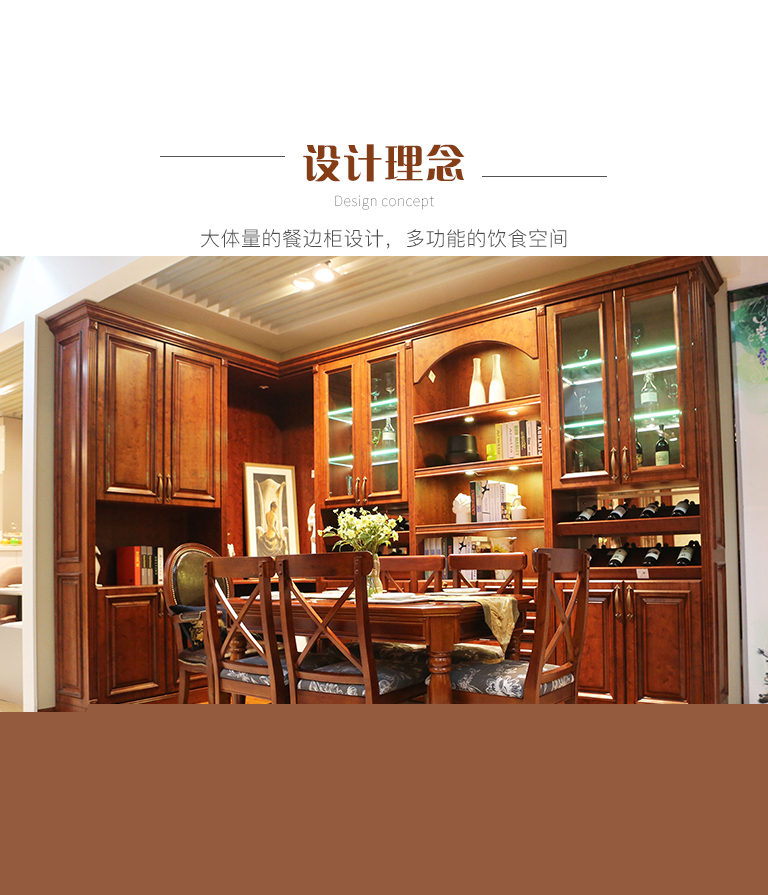 | 細(xì)節(jié)描述 | 餐廳餐邊柜需要大體量多功能。餐邊柜內(nèi)部格局的設(shè)計(jì)合理,敞開(kāi)式的層板上和玻璃門(mén)板可以擺放書(shū)、畫(huà)冊(cè)、裝飾品以及漂亮的餐具,在柜體的部分空間加裝柜門(mén),里面可以存放餐巾布、食物等比較瑣碎的物品。還有收納功能儲(chǔ)物柜,可以供放置碗碟筷、酒類(lèi)、飲料類(lèi),以及臨時(shí)放湯和菜肴用,也可放置客人包小物件,酒插格放置美酒,每一次吃飯都是享受。 |