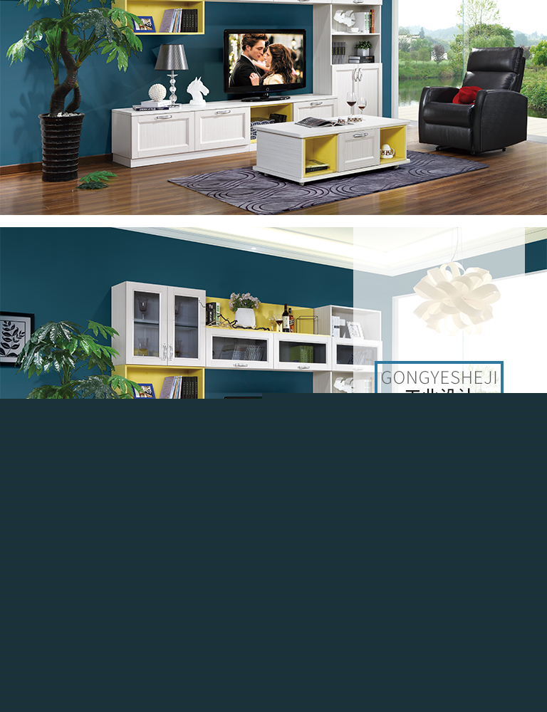 此空間為蘇香桐套檸檬黃的定制電視柜,茶幾